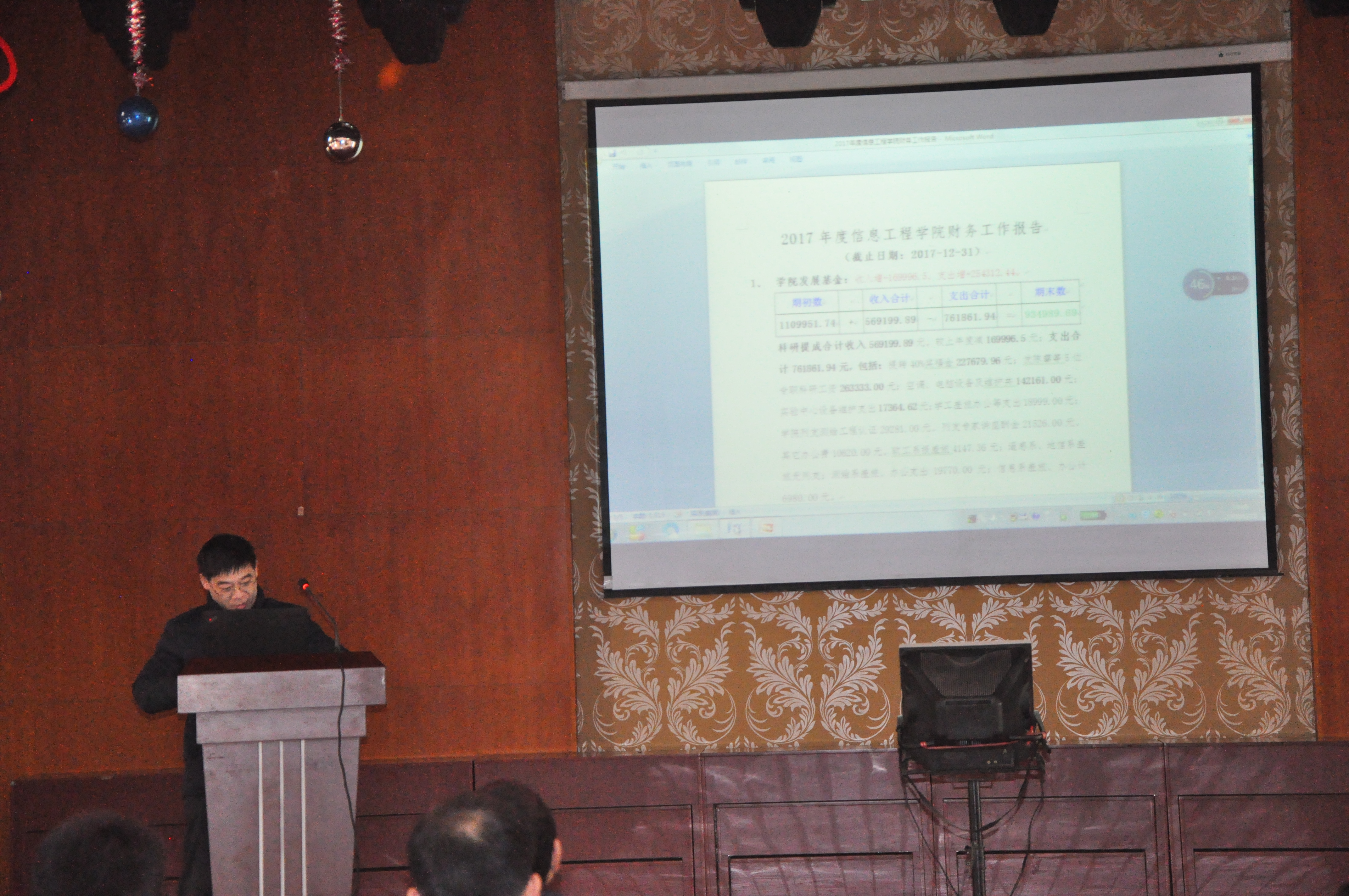 2018年1月23日下午14时,信息工程学院在校工会一楼教工活动中心召开2017年教职工大会。全院教职工参会,由副书记许德华主持,大会的主要任务是审议院长工作报告、学院财经工作报告和工会年度工作报告。