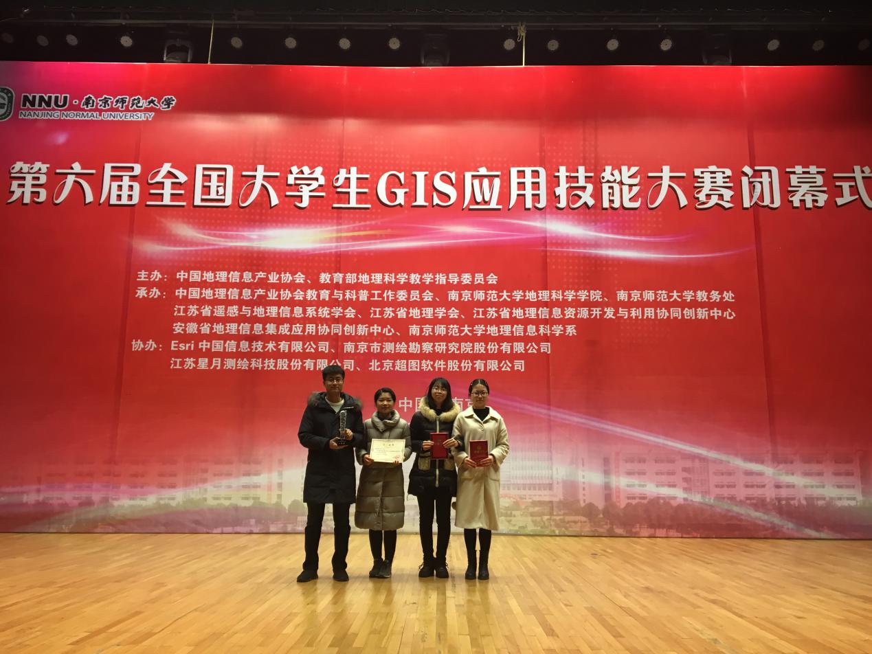 2017年12月8日,由信工学院晁怡、祁昆仑老师指导,林欣、范雯、郭北阳、刘一飞同学组成的中国地质大学(武汉)代表队在江苏南京参加第六届全国大学生GIS应用技能大赛,获得一等奖。