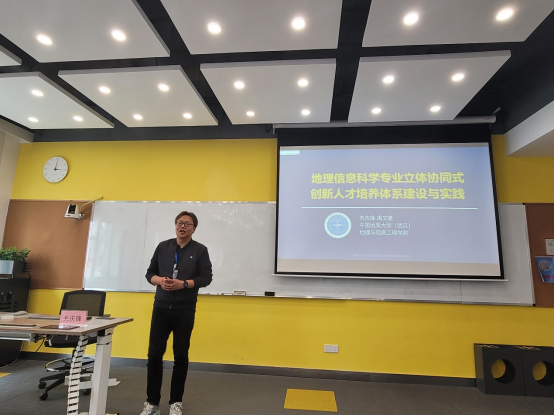 副院长关庆锋以“地理信息科学专业立体协同式创新人才培养体系建设与实践”为题进行了汇报交流。他从GIS专业人才的需求和创新能力培养的重要性入手,介绍了我校“二结合三协同”地理信息科学专业创新人才培养体系建设思路和取得的成果,以及地理信息科学一流本科专业建设进展。