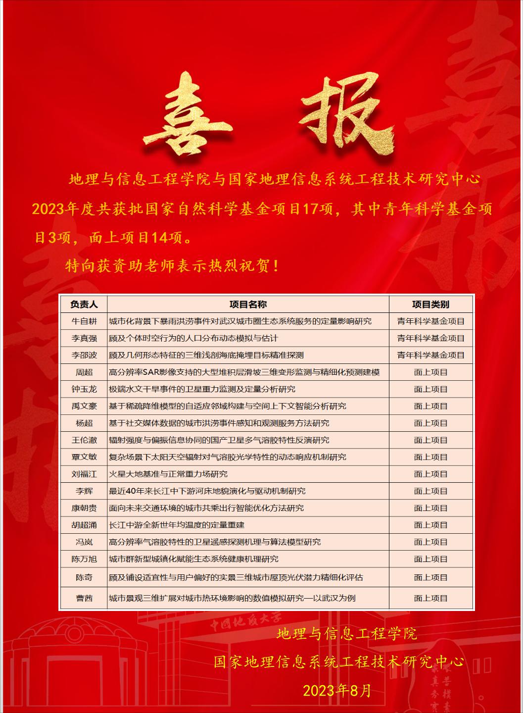 伟德Betvictor中文 与国家地理信息系统工程技术研究中心2023年度共获批17项国家自然科学基金项目