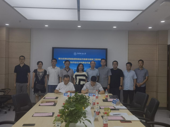 最后,张志艺站长、王绍强院长代表双方签订了战略合作框架协议,并共同为中国地质大学(武汉)“湖北省测绘质量监督检验站-大学生实习实践基地”揭牌。与会人员见证了协议签订仪式并合影留念。