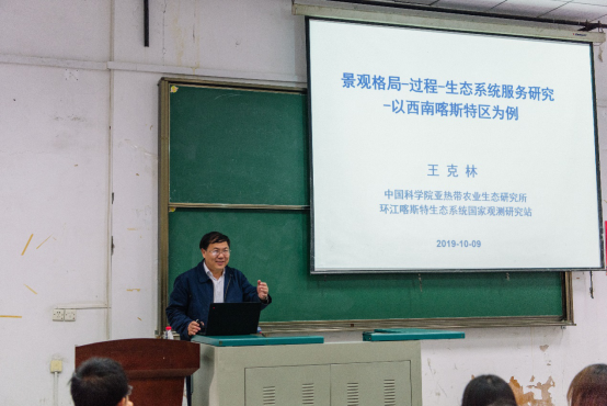王克林研究员从“景观”这一人与自然相关作用的基本单元出发,向在座师生介绍了景观地理学的发展过程和研究方法,并以环江喀斯特生态系统国家观测研究站所处的西南地区为例,介绍了生态系统研究的进展。王克林研究员介绍了喀斯特地区的景观退化背景,并对石漠化下的水土过程模拟与估算方法进行了详细介绍。在这样的生态背景下,当地的景观可持续恢复与生态系统服务提升具有重要的意义。讲座最后,王克林研究员分析了生态系统研究在我国的发展现状以及面临的机遇和挑战,并对我国喀斯特地区的生态环保政策制定提出了建议。