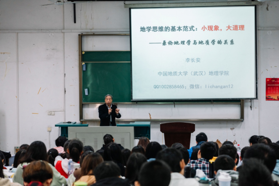 李长安教授用哈佛大学校长对教育的理解作为开篇,给同学们阐明了教育有何作用,以及什么是科学理性的思维。李长安教授用自己求学的经历作为例子,介绍了地质学研究与其他科学研究的异同点,自然科学的研究虽然在具体方向上有所不同,但在整体的研究方法上,都可以遵循相似的范式。李长安教授还通过对各地岩臼形成机理的探讨与论证的过程,生动具体地向同学们展示了如何进行严谨科学地假设与论证。最后,李长安教授给同学们提出期望,希望同学们把地质学基础打扎实,发挥我校在地球科学领域的特长,在地理学学习与科研中取得更大的进步。讲座在同学们的热烈掌声中结束。