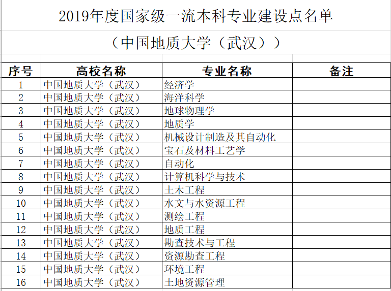 注:我校入选国家级一流本科专业建设点的专业是:地质学、资源勘查工程、水文与水资源工程、环境工程、土木工程、地质工程、地球物理学、勘查技术与工程、机械设计制造及其自动化、经济学、测绘工程、宝石及材料工艺学、土地资源管理、计算机科学与技术、自动化、海洋科学;入选省级一流本科专业建设点的专业是工商管理、地理信息科学。