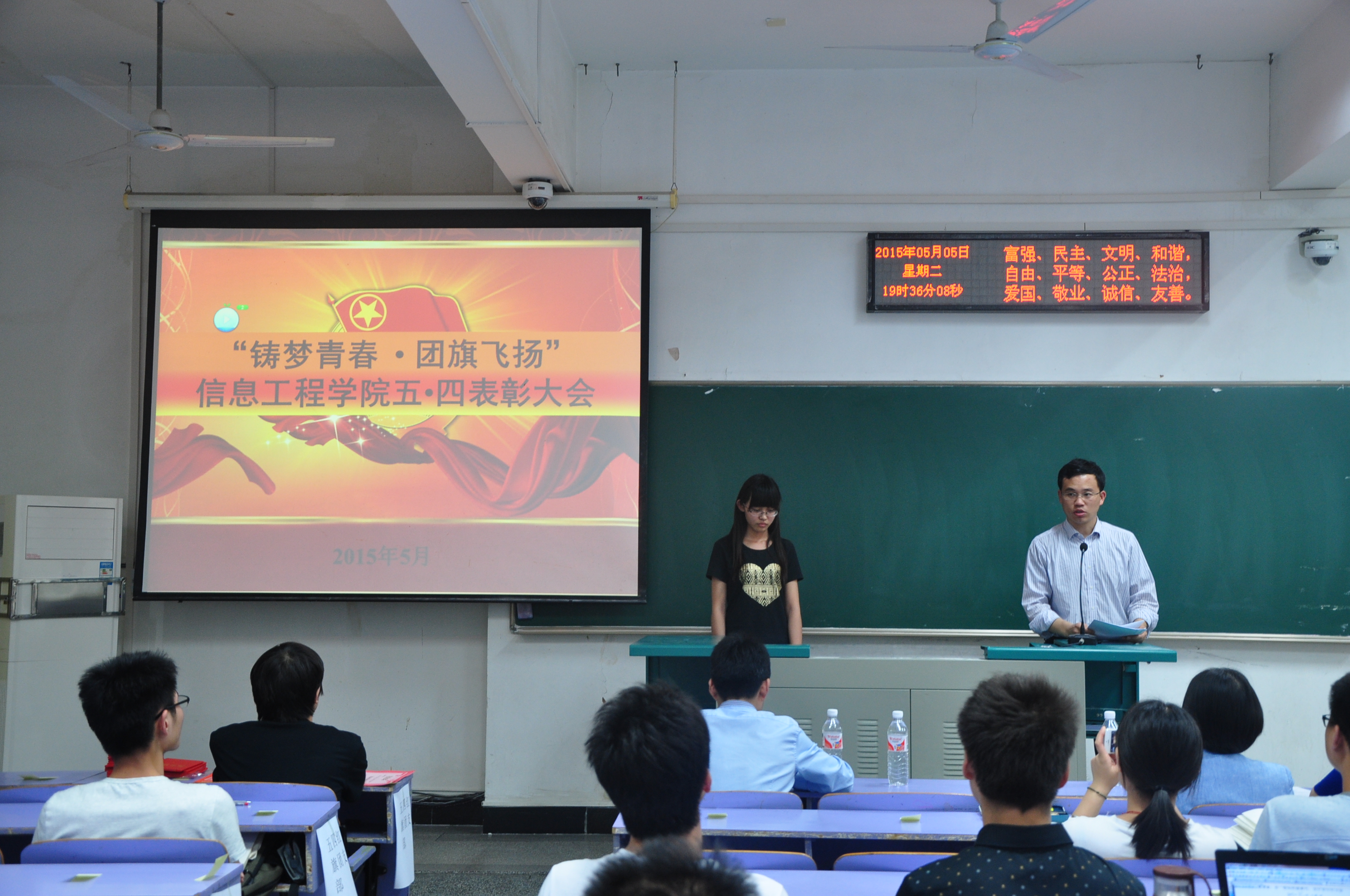 在五﹒四青年节来临之际,为嘉奖先进集体,表彰优秀个人,5月5日晚7点30分,信工学院于教三楼706教室举行了五•四表彰大会。信工学院党委书记黄菊、学工组全体老师以及获表彰同学参会。大会由武彦斌老师主持。