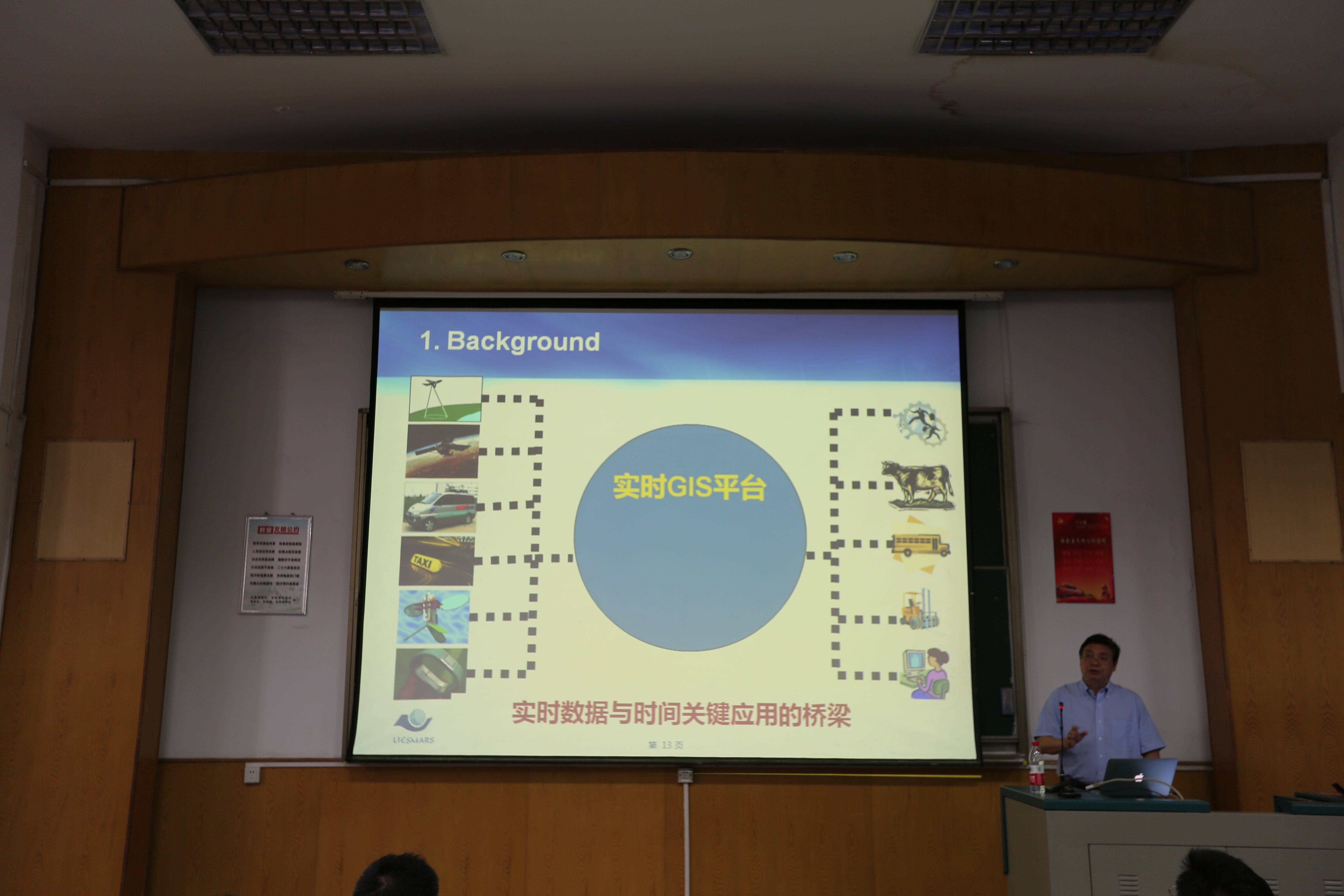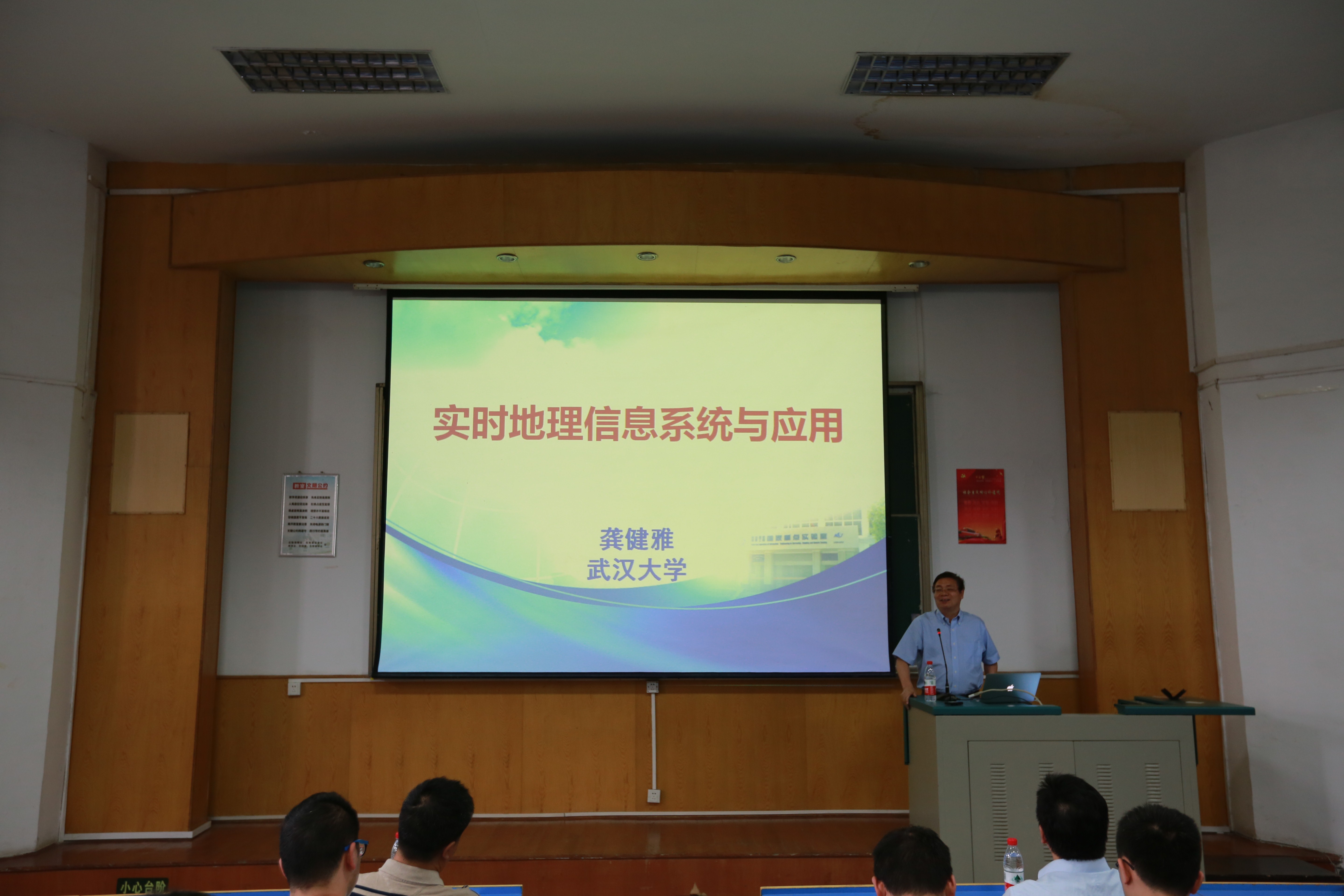报告还没开始,教室里已座无虚席。四点整,谢忠院长简单介绍龚健雅院士后,讲座正式开始。龚院士从背景、实时GIS的主要特征、实时GIS的研究进展、实时GIS的应用以及结论展开。