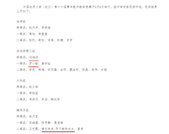 中国地质大学(武汉)第十六届青年教师教学竞赛于5月8日举行。伟德Betvictor 地理科学系冯海波老师、测绘遥感系罗小敏老师在非地学理工组分别获得特等奖、一等奖,辅导员穆巴热克.阿不都热依木老师荣获辅导员组二等奖。