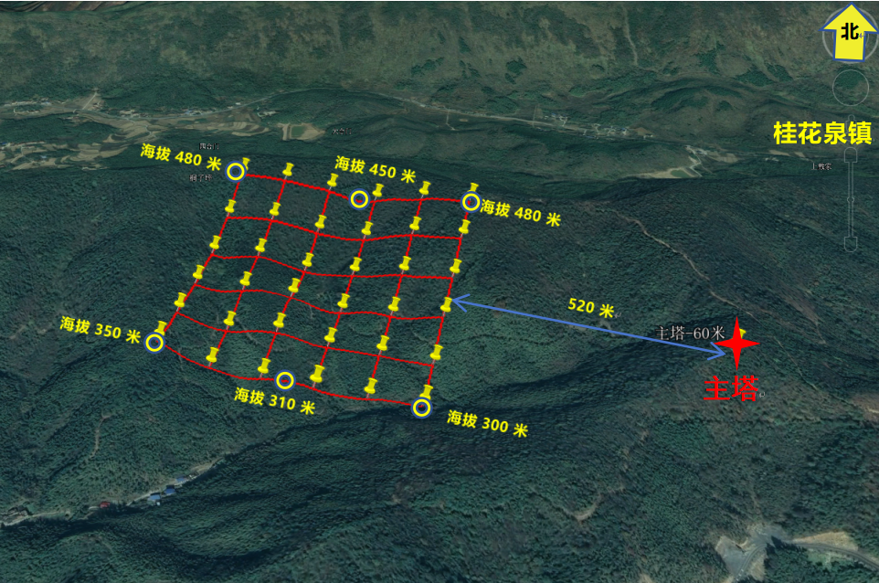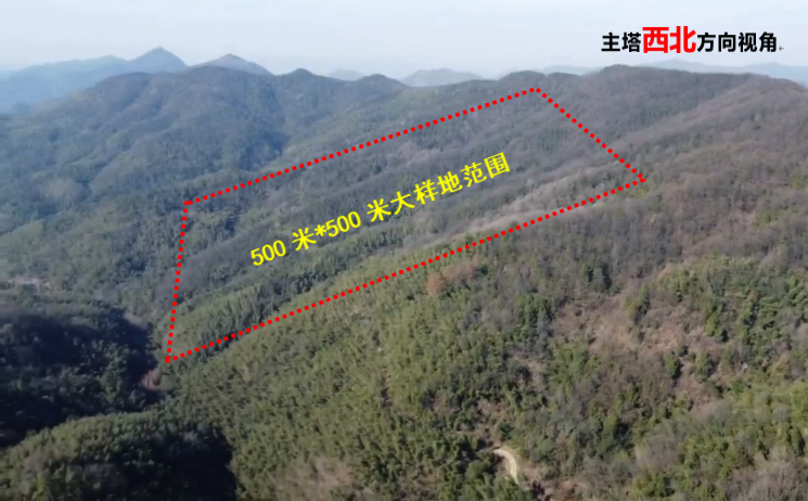 大样地位于观测站60米高主塔西北方向520米朝南山坡,面积25公顷(500米×500米),高程落差150米,涵盖有针叶林、阔叶林、针阔混交林、竹林等植被类型。大样地可满足遥感监测、无人机航拍和传统森林实验(“样点—样带—样区”),未来将进一步设置森林固定样地(20米×20米)和多种监测设备,通过观测数据自动回传实现幕阜山丘陵地球关键带植物群落结构、生态系统结构和功能的长期监测。