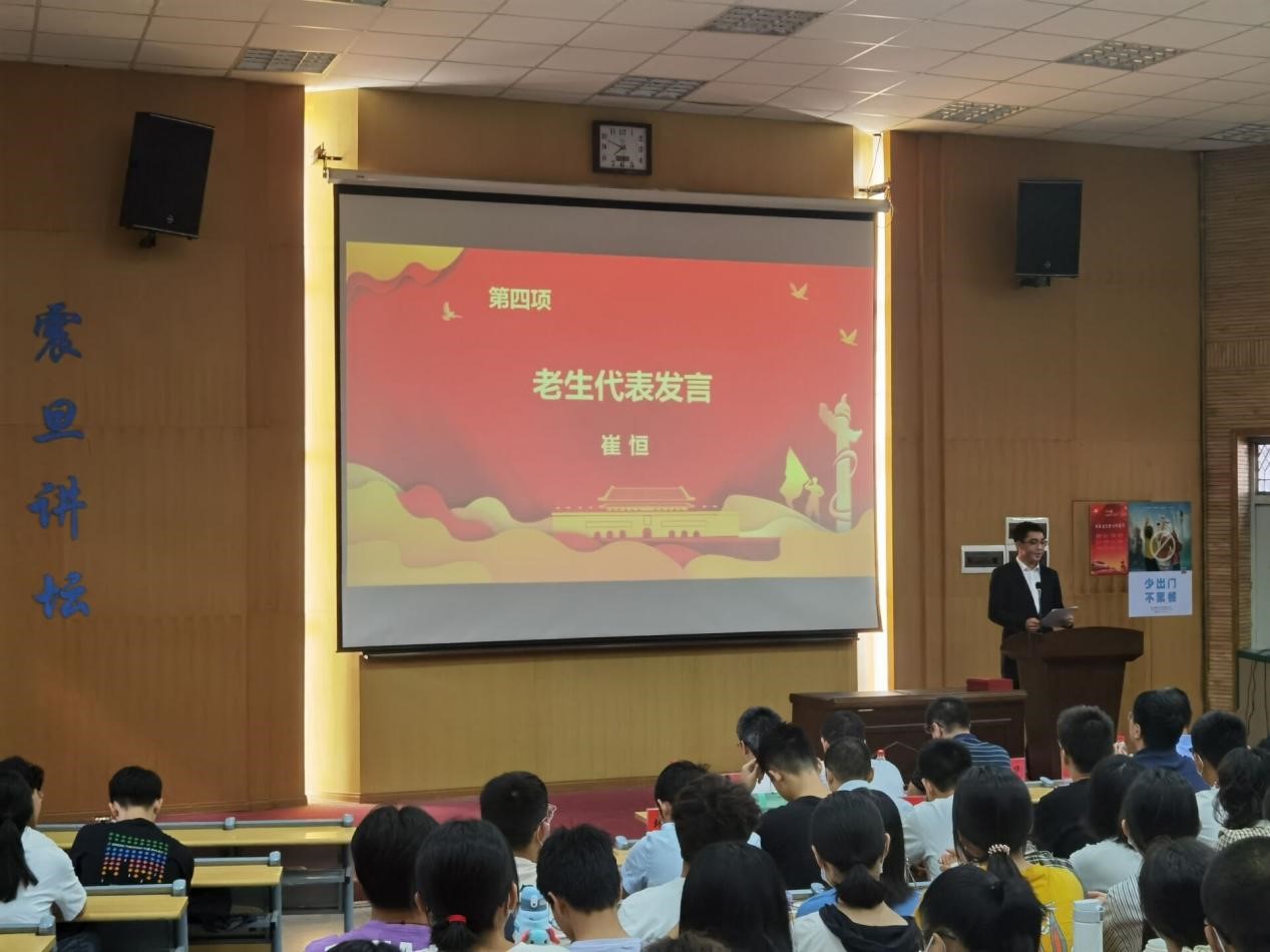 会议第四项,老生代表崔恒发言。崔恒同学以自身经历讲述了树立自信、制定目标的重要性,勉励大一新生要充实且多彩的度过大学生活,希望学弟学妹们能慢慢成长为真正“大气做人、灵气做事”的地信人。