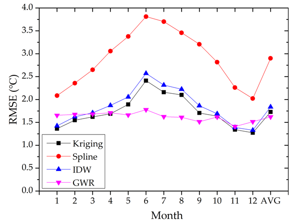 图2基于地理加权回归模型(GWR)、克里金模型(Krigng)、样条函数(Spline)和反距离加权模型(IDW)的的中国陆地区域2010年月度平均近地表气温估算精度比较。