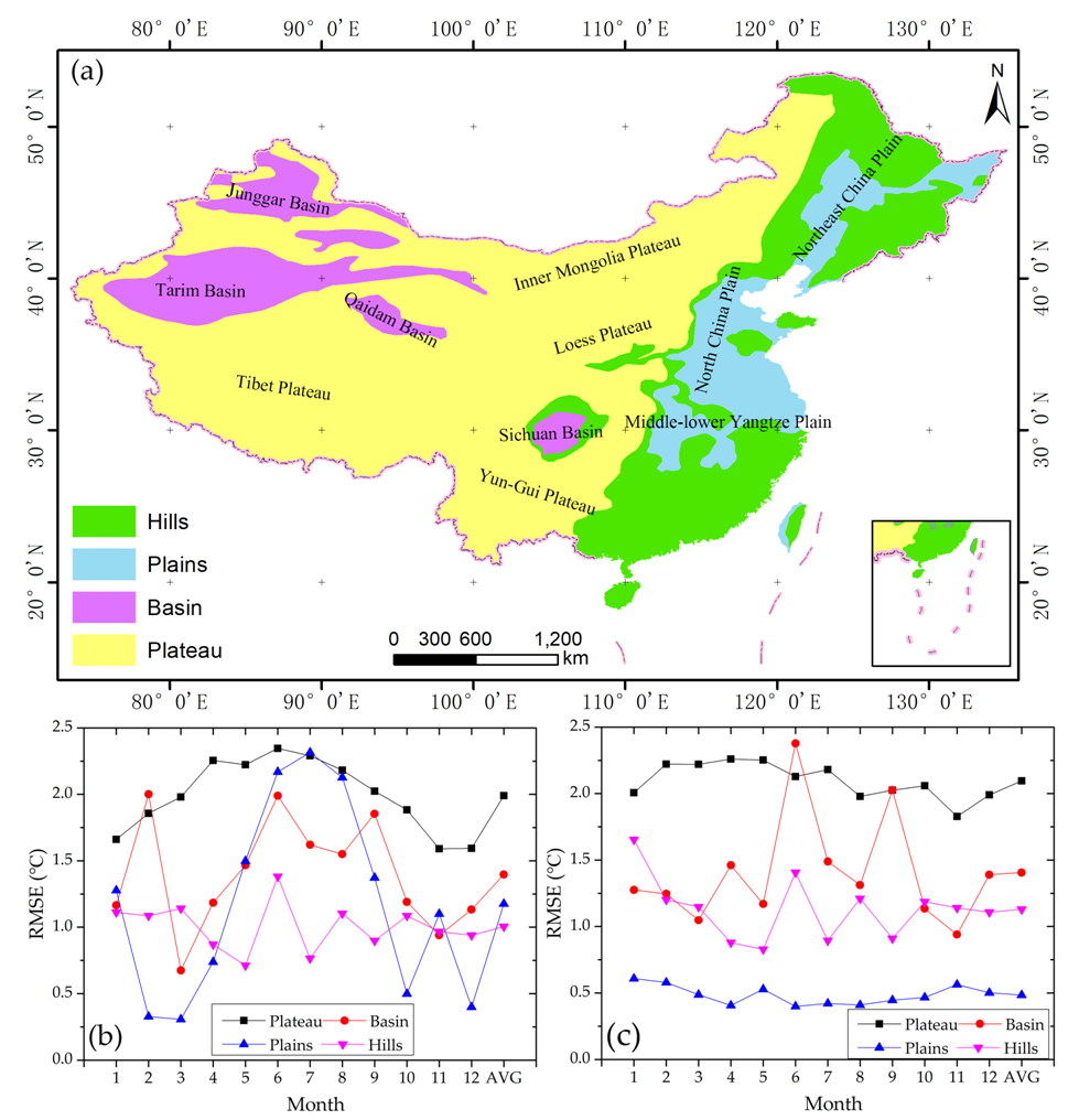 图4不地形类型条件下基于地理加权回归模型和克里金模型的近地表气温估算精度比较;(a)中国陆地区域地形类型分布图;(b)不同地形类型条件下基于地理加权回归模型的月度平均近地表气温估算精度;(c)不同地形类型条件下基于克里金模型的月度平均近地表气温估算精度;Hills表示山区,Plains表示平原,Basin表示盆地,Plateau表示高原。