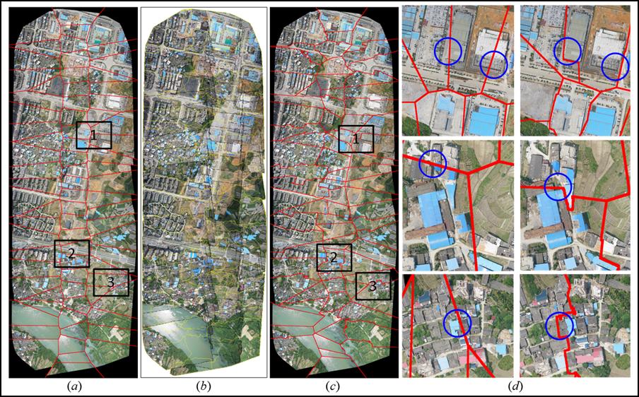 图1 (a)表示初始镶嵌线,(b)表示OrthoVista软件生成的镶嵌线,(c)表示本文方法生成的镶嵌线,(d)表示(a)和(c)中的黑色矩形区域