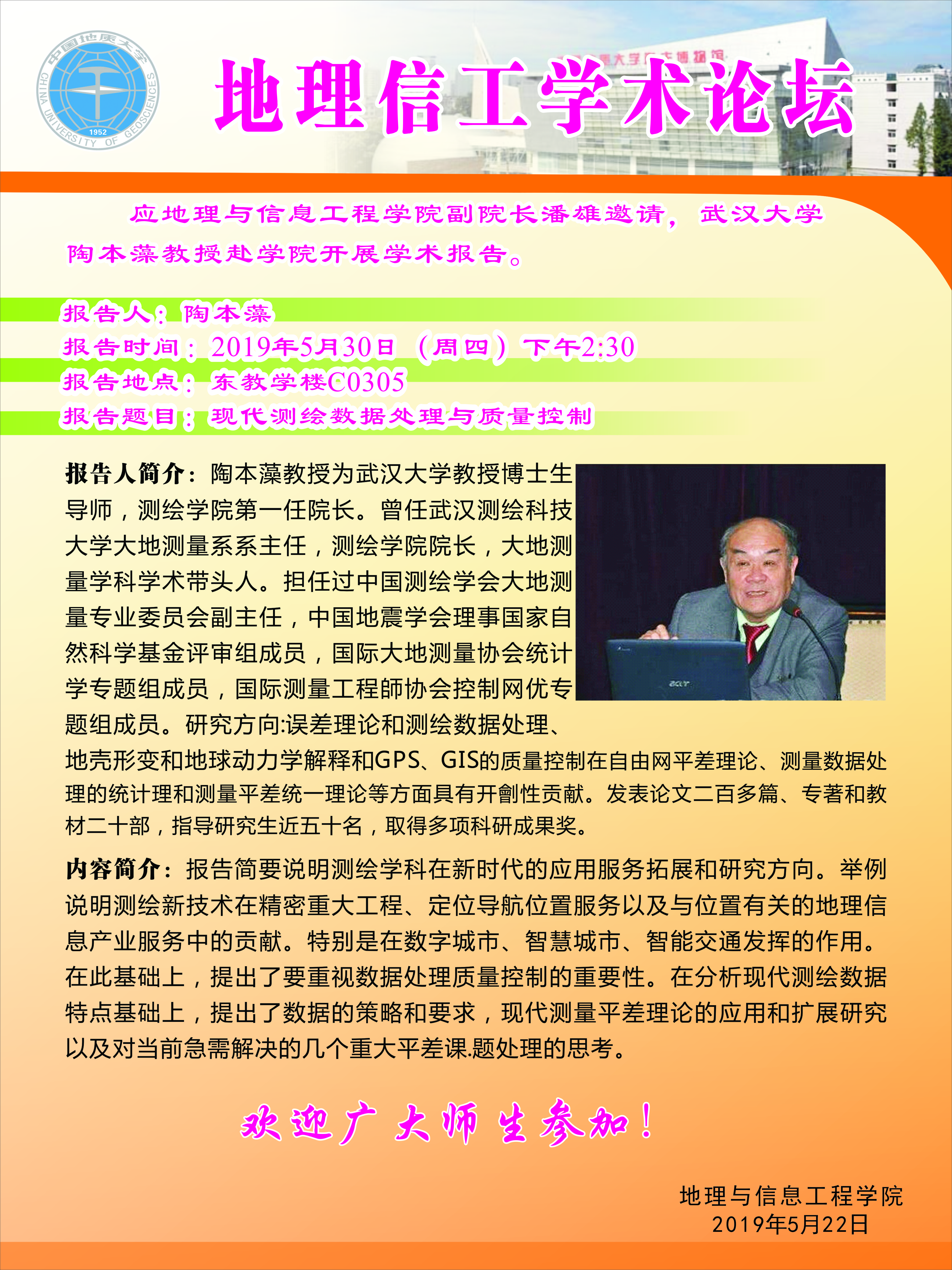 伟德Betvictor学术论坛第133期:武汉大学陶本藻教授