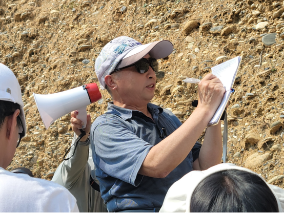 实习师生在郧阳区汉江Ⅳ阶地观察点进行考察。中国地质大学(武汉)李长安教授首先围绕河流砾石的砾径、砾态、砾性、砾石的定向排列(叠瓦状构造)及河漫滩沉积物展开讲解,分析了冲积物与其它成因沉积物的区别,引导学生思考汉江河流阶地砾石与太极峡晚白垩世泥石流成因砾岩的区别;其次以丰富的野外工作经验介绍了侵蚀阶地、基座阶地、堆积阶地和埋藏阶地河流阶地类型的判别方法、河流阶地的定级规则和汉江河流阶地的发育概况,讲授古河流流向的判断方法和河流阶地剖面图的作图方法。实习师生观察冲积物的二元结构和叠瓦状构造等主要特征,学习砾石AB面产状的测量方法,作燕子矶剖面素描图、青龙台观景台-柳陂镇-汉江河流阶地剖面图,锻炼野外工作技能,展现地理人吃苦耐劳的精神。