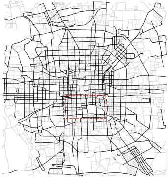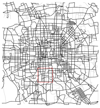 路网综合是地图学领域的经典问题,其目的在于,减少地图目标数量的同时,尽量保持综合前后路网的整体模式特征。该技术可支持地图数据金字塔模型构建、矢量数据渐进式传输以及网络地图多尺度表达等应用。路网综合算法的关键是提取道路结构的模式特征,并依此设计弧段选取策略。然而,传统方法仅关注路网的几何和拓扑属性,通过引入图论、路划(stroke)等模型,选取拓扑显著的中心弧段和几何连续性较好的邻接弧段。人们由导航地图选择路径的过程中,除了关注弧度的拓扑和几何属性,往往更强调弧段之间的功能联系。该特征反映到地图上即为邻接弧段共同形成一条出行路径的概率。交通联系较大时,相应道路应被视为一个整体来考虑(即在地图上同时被删除或保留),以保证高频通行路线的完整性。