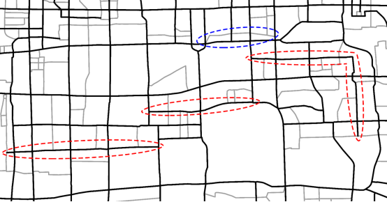 基于以上思想,接下来的问题便是如何量测弧段间的功能联系。本文通过引入交通大数据的出租车轨迹流,判断弧段间是否存在显著的交通流;若存在,则认为弧段间具有较强的功能联系(图1),在地图综合过程中,需同时保留或删除相应弧段,以最大程度还原真实场景下人们的路径选择(图2)。