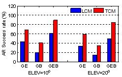 图3. 10o与20o截止高度角时,松组合与紧组合RTK的模糊度固定成功率(a: 单频;b:双频)。GE代表GPS/Galileo,GB代表GPS/BDS-3,GBE代表GPS/BDS-3/ Galileo;模糊度固定时Ratio阈值为3.0