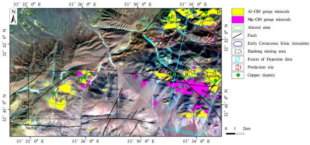 图3. 采用投票极限学习机算法处理ASTER 短波红外-热红外数据所得蚀变矿物分布信息
