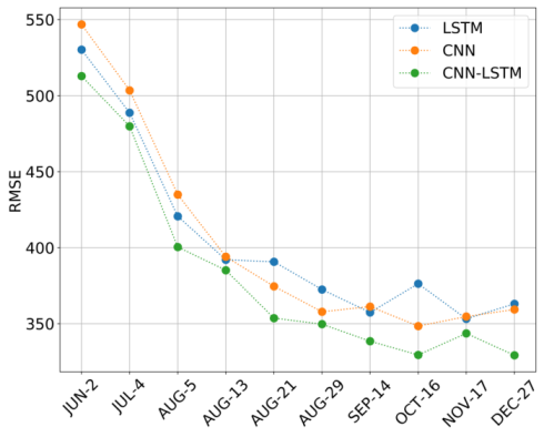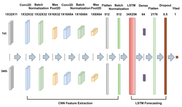 Earth Engine (GEE),将所有这些训练数据合并并转换为基于直方图的张量进行深度学习。实验结果表明,所提出的CNN-LSTM模型无论是季末还是季内预测性能都优于单纯的CNN或LSTM模型。该方法在提高玉米、小麦、马铃薯等作物未来精细尺度产量预测的准确性方面具有很大的潜力。