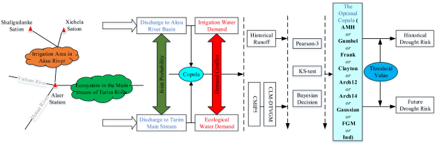 因此,受中国科学院先导A项目和国家自然科学资金的支持,本研究着眼于中国“一带一路”经济发展政策沿线-塔里木河流域,从该流域上游绿洲农业用水严重挤占中下游生态用水的事实出发,借助于水文资料、CMIP5数据和CLM—DTVGM(Community Land Model-Distributed Time Variant Gain Model,陆面模式-时变增益模型)水文模型,权衡流域内的绿洲农业发展和生态发展,以径流多年均值为阈值,基于贝叶斯方法确定了最佳的Copula函数形式。随后,基于最佳的Copula函数形式确定了山区来水量及上游向中下游输水量的联合分布关系,以通过K-S(Kolmogorov-Smirnov)检验的Pearson-III概率分布为边缘分布,确定了塔里木河流域历史水文干旱风险和未来三种气候情景下(RCP2.6,RCP4.5,RCP8.5)水文干旱风险,具体研究思路见图2。