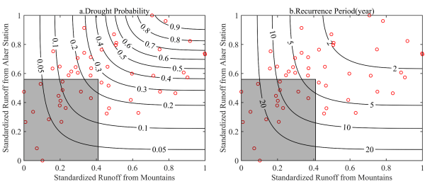 该研究发现,在同时考虑上游农业发展和中下游生态发展的前提下塔里木河流域历史水文干旱风险概率为0.25,干旱重现期为4年(图4),未来三种气候情景下的水文干旱风险分别为0.23, 0.15和0.18,干旱重现期为4.3年,7年和5.6年(图5)。