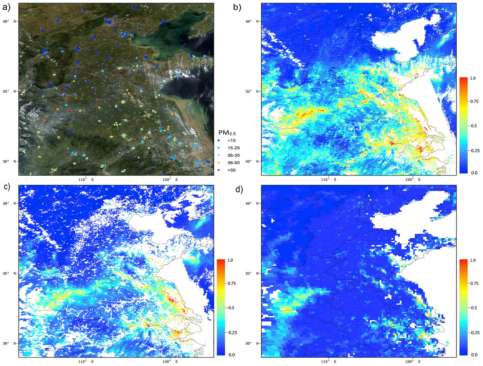 图1 a) 地面站点PM2.5观测;b) MODIS MAIAC 1 km AOD; c) MODIS 3 km AOD; d) MODIS DB 10 km AOD