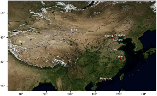 图2 研究所用CARSNET(蓝色)和AERONET站点(红色)
