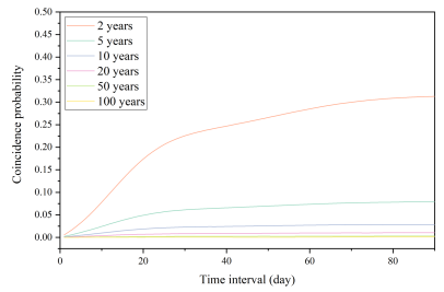 本文以长江上游金沙江流域为例研究了极端降水的多维遭遇风险。拟合长期极端降雨序列的量级分布和发生时间间隔的边际分布;建立二维和三维copula模型,联合量级和时间间隔;评估多个地点极端降水的超越概率和一致性概率。超越概率代表两个站都发生大于一定量级极端降雨(如20、50、100年一遇)的概率: