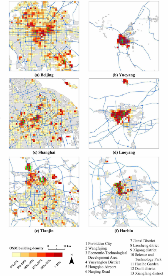 图2 2017年中国六个典型城市的OSM建筑数据密度分布