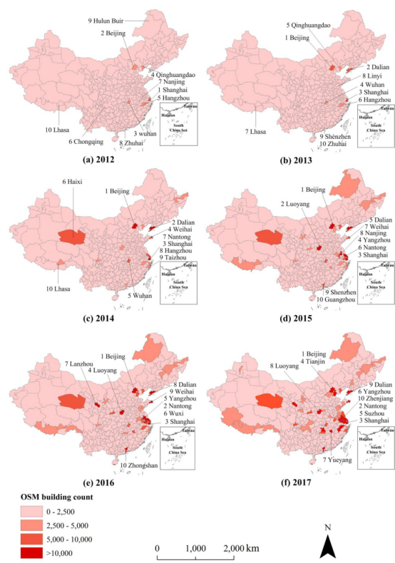 图1 2012-2017年中国各个地级市OSM建筑数量的时空分布