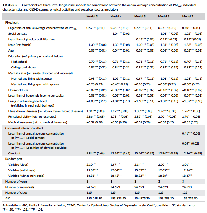 结果:在添加中介体之前,老年人的抑郁症状随PM2.5的年浓度增加而加重(Coeff = 0.57,SE = 0.11)。但在添加介体后,其抑郁症状随PM2.5的年浓度系数降低而减轻(Coeff = 0.37,SE = 0.10)。 同时体育活动(边缘检验Z得分= 2.37,P值= .02)和社交接触(Z得分= 7.33,P值= .00)均对PM2.5与抑郁之间的关系存在中介作用,其中介作用随PM2.5的增加而减弱。