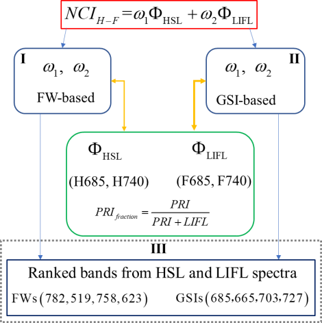 基于上述构造过程,首先选择两个固定波段的光谱特征用于求解联合光谱指数(685nm和740nm),并利用ANN构建其与LNC的反演模型,并同时利用荧光光谱特征改进光合作用指数PRIfraction(图1),比较LNC估计结果;随后依据权重值和敏感度指数对所有的反射荧光光谱波段关于LNC进行排序,选取前四个特征重复上述构造指数和ANN反演过程。