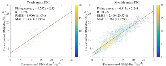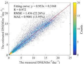 本研究采用1993-2014年覆盖全国范围的17个CMA观测站点的太阳法向直接辐射量观测数据(129662个样本),验证了本研究所构建的太阳法向直接辐射量的精度。结果显示:本研究所重建的DNI数据集与观测值高度相关;在东亚地区的5处BSRN站点,RMSE、MAE、RMSER、MAER 和R分别为1.436 MJm-2、0.900 MJm-2、22.26%、13.95%和0.972;在17处CMA观测站点,RMSE、MAE、RMSER、MAER和R分别为4.064 MJm-2、2.864 MJm-2、34.41%, 24.26% 和0.914。此外,本研究将所重建的DNI数据集与CM-SAF、PV-GIS和NERL-SWERA等DNI数据集的精度进行对比验证,得出本研究所构建数据集的精度要优于这三类DNI数据集。