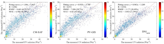 图3. CM-SAF、PV-GIS和NERL-SWERA的太阳法向直接辐射量产品精度验证图