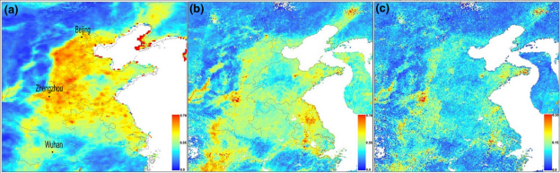 图4 2018年AOD(550nm)年均值 (a) MODIS深蓝AOD,(b) MISR AOD,(c)MISR大模态AOD