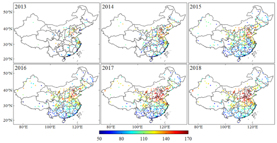 尽管PM2.5浓度迅速下降,但夏季区域性O3污染成为中国东部地区新的空气质量问题。如图4所示,中国北方日间最大8小时O3浓度的平均值从2013年的120μg/ m3增加到2018年的170μg/ m3(高于中国环境空气质量标准规定的160μg/ m3)。作为O3的主要气态前体物之一,NOx的排放在2013-2018年期间明显减少了。然而,气溶胶消光减小使中国东部太阳辐射得到大幅增强,进而促进光化学反应中O3的形成,这可能是东部地区臭氧污染加重的原因。