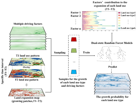 自从Tobler首次将元胞自动机(CA)应用于地理模拟以来,CA已经被广泛地应用于自然和社会经济因素影响下的土地利用时空动态建模,并模拟它们在不同尺度上的相互作用。然而许多现有的CA模型在1)揭示土地利用变化的潜在驱动力方面;以及2)模拟多种土地利用的斑块演化方面表现较弱,特别是对于自然土地利用类型的斑块演化。