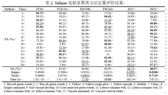 同样以美国萨利纳斯农场数据Salinas为例,验证该算法的有效性。选取7种典型的聚类方法作为对比算法,其聚类结果如图8和表2所示。从图8和表2中可以看出,提出的两种稀疏聚类方法在该场景中分别取得了最优及次优的聚类结果,相比于其他聚类方法,聚类精度有明显提高。此外,可以发现,两种稀疏聚类方法均较为高效,时间成本较低,具有很强的实用性。