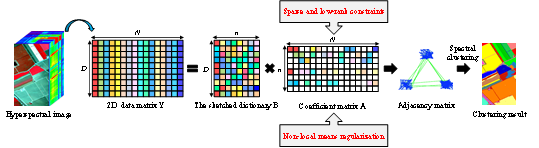 首先介绍第一种方法,非局部可拓展加权稀疏低秩子空间聚类(NL-SSLR)。为有效降低子空间聚类模型的计算复杂度,我们引入可拓展子空间聚类模型(Sketched subspace clustering model),利用随机投影快速构建具有同等刻画能力的压缩字典,如图1所示,用于像素自表达学习,从而高效挖掘高光谱影像数据结构。在此基础上,构建加权稀疏低秩表达模型,同时挖掘高光谱影像像素点集潜在的局部结构信息和全局结构信息,从而更加准确的学习高光谱像素之间潜在的邻接关系;另一方面,构建非局部均值正则化约束,探究影像的自相似性,耦合影像非局部空间信息在表达域一体化建模,充分挖掘影像空-谱特征在表达域的高判别性,同时促进系数矩阵的平滑性,以保障聚类结果的空间一致性。