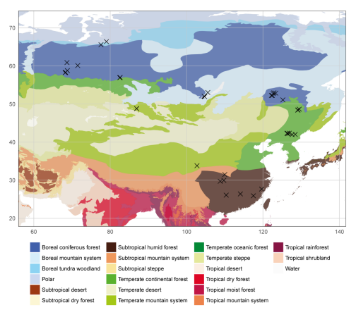 和关键带演化湖北省重点实验室。参加者来自中国地质大学(武汉)、东北师范大学、莫斯科大学、俄罗斯科学院气候变化和生态系统西伯利亚监测站,以及约克大学等十多个科研机构。该研究历时约十余年,收集了亚洲地区东起勘察加半岛-远东地区和兴安岭-长白山区一线,西至贝加尔湖-西西伯利亚的广大地区,北起亚北极圈,南至中国南方亚高山湿地群,采集样品近3000余份,覆盖了亚洲泥炭湿地的大部分区域(图1)。
