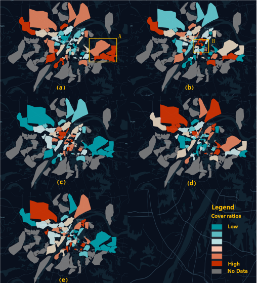 街景元素分布分析 (a) sky, (b) road, (c) building, (d) tree, (e) sidewalk at a community scale.