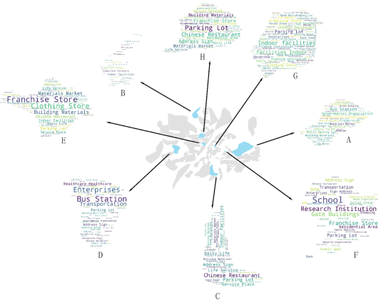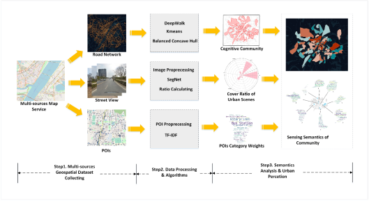 随着现代城市的快速发展,城市中的场所(Place)发生了巨大的变化和重塑。场所是地理信息系统科学和城市研究的一个基础和重要的概念。具体而言,场所在定义与城市居民活动相关的语义和空间概念方面具有重要作用,它是地理现实的本质和人类认知发展等众多研究的基础。对场所语义的感知以及以人为本的理解是人文地理学和城市规划的核心主题之一。行政性场所、主题性场所、功能性场所和认知性场所已被公认为基本的区域分类方法。主题性场所是指被人群感知的区域,具有一个或多个变量和丰富的语义。而认知性场所一般在人脑中,边界模糊。语义场所和认知场所都是从人类对场所的体验和理解中产生的概念,它们通过与周围社会和物理环境的交互产生。提取、评价并理解城市内部空间的语义场所在旅游规划、城市交通、城市地理学等应用中具有重要意义。对于居民而言,认知场所强调人们对该区域的主观描述(如哪些地方更宜居,哪些地方看起来更安全?),因此有助于城市居民感知周边的生活环境。对于城市规划师或建筑工作者而言,认知场所突出城市内部建成环境,因此常被应用于空间绿化、城市功能结构、城市天际线等城市感知相关的研究,为可持续的城市化策略提供支持。对于城市研究者而言,主题场所相关的研究能够提供定量化的信息或者潜在的地理语义知识,这些将为定量化探索城市空间结构与社会经济关联关系提供可能。