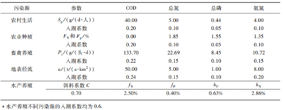 本研究采用实测法监测后官湖周边工业污染源、城镇污水处理厂等稳定排放口的污染物排放量;部分未经集中收集和处理的污水渠道为非稳定排放,如城市地表径流,这部分污染通过实测法测得一定时间内的污染物浓度与流量,再经平均浓度法估算全年排放量;同时,后官湖流域内,存在诸多的村庄、有一定规模的农村养殖业和农业生产,这些污染源的排放具有典型的面源性质,通过排污系数法进行核算,计算方法如表1所示。 实际入河量除以计算污染排放量得到入河系数,再参考相关研究,入湖系数的研究成果,确定后官湖流域不同污染源的平均入湖系数,如表2所示