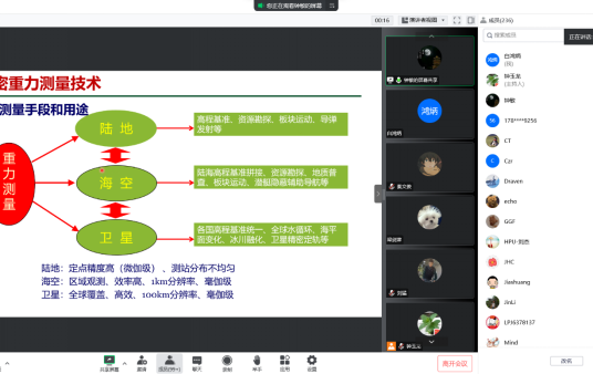 线上线下的参会人员围绕卫星重力检验与标定场建设等内容与钟敏老师展开了热烈的讨论,增进了相互深入的了解。