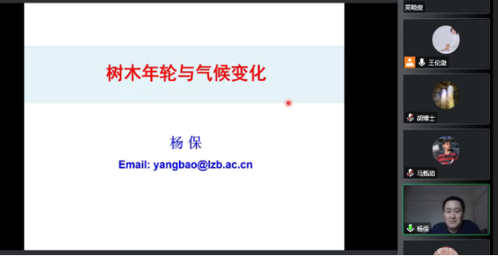 王伦澈教授邀请,中国科学院西北生态环境资源研究院杨保研究员做客中国地质大学(武汉)第86期名家论坛暨校庆七十周年学术交流会,以线上形式作题为“树木年轮与气候变化”的学术报告,受到师生的广泛欢迎。报告由王伦澈教授主持,线上、线下与会人数共计逾300人。