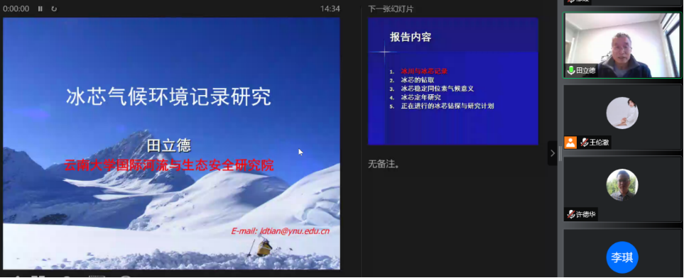 王伦澈教授的邀请,云南大学田立德研究员做客中国地质大学(武汉)第115期名家论坛暨校庆七十周年学术交流会,以线上形式作题为“青藏高原冰芯气候环境记录研究”的学术报告,受到师生的热烈欢迎。报告由王伦澈教授主持,线上与会人数共计逾100人。