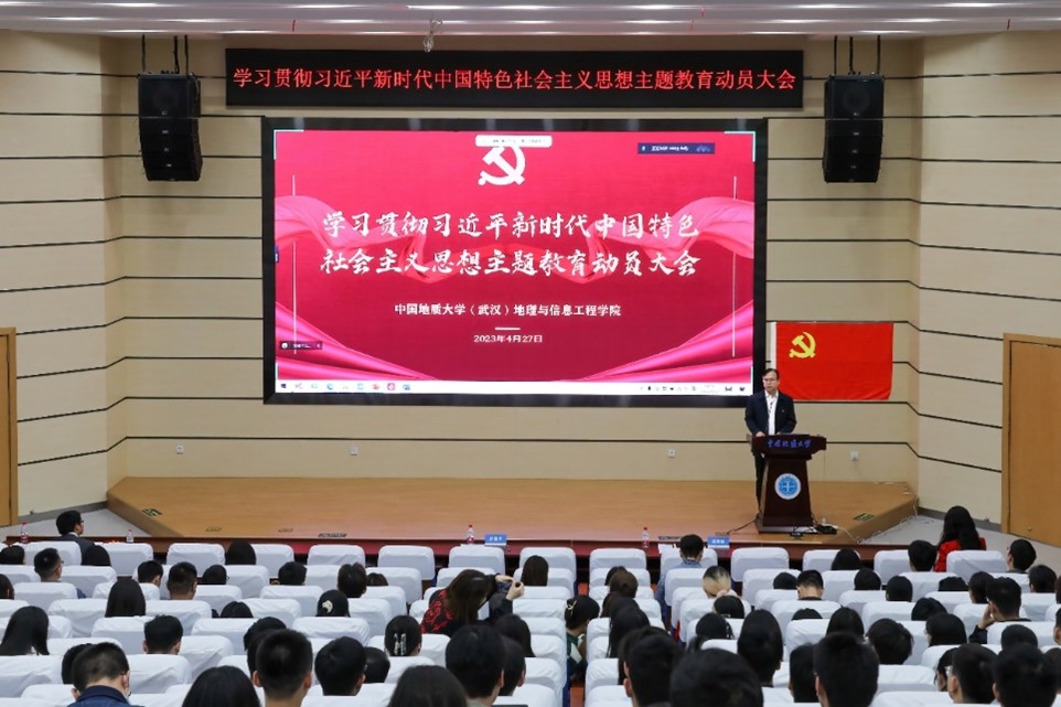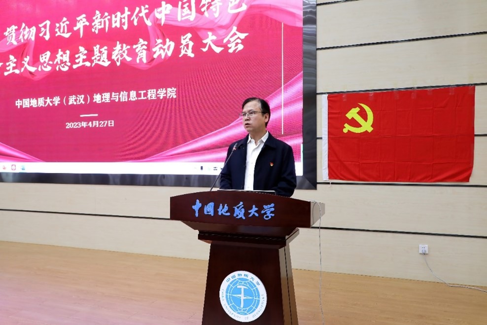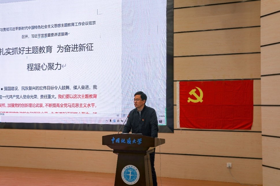 武彦斌解读了学校《关于深入开展学习贯彻习近平新时代中国特色社会主义思想主题教育的方案》及《学习贯彻习近平新时代中国特色社会主义思想主题教育理论学习方案》,并带领与会师生从指导思想、主要议程、组织领导及工作要求等方面集中学习了《中共中国地质大学(武汉)委员会关于召开第十三次党员代表大会的通知》,引导广大师生以良好的精神风貌迎接学校第十三次党代会胜利召开。