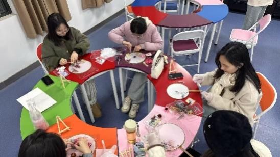 3月7日妇女节前夕,“花漾女神”干花团扇制作专场在未来城校区温情呈现。曹思烨同学以团扇发展史为引,揭开"轻罗小扇扑流萤"的文化密码。师生们将永生花材精心布局于绢扇之上,玫瑰的馥郁、满天星的灵动在指尖交织成画。活动现场欢声笑语不断,十余件兼具古典韵味与现代审美的作品,成为节日里最暖心的礼物。