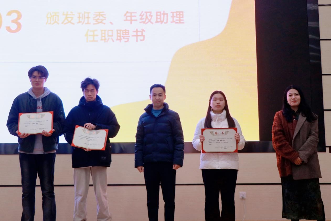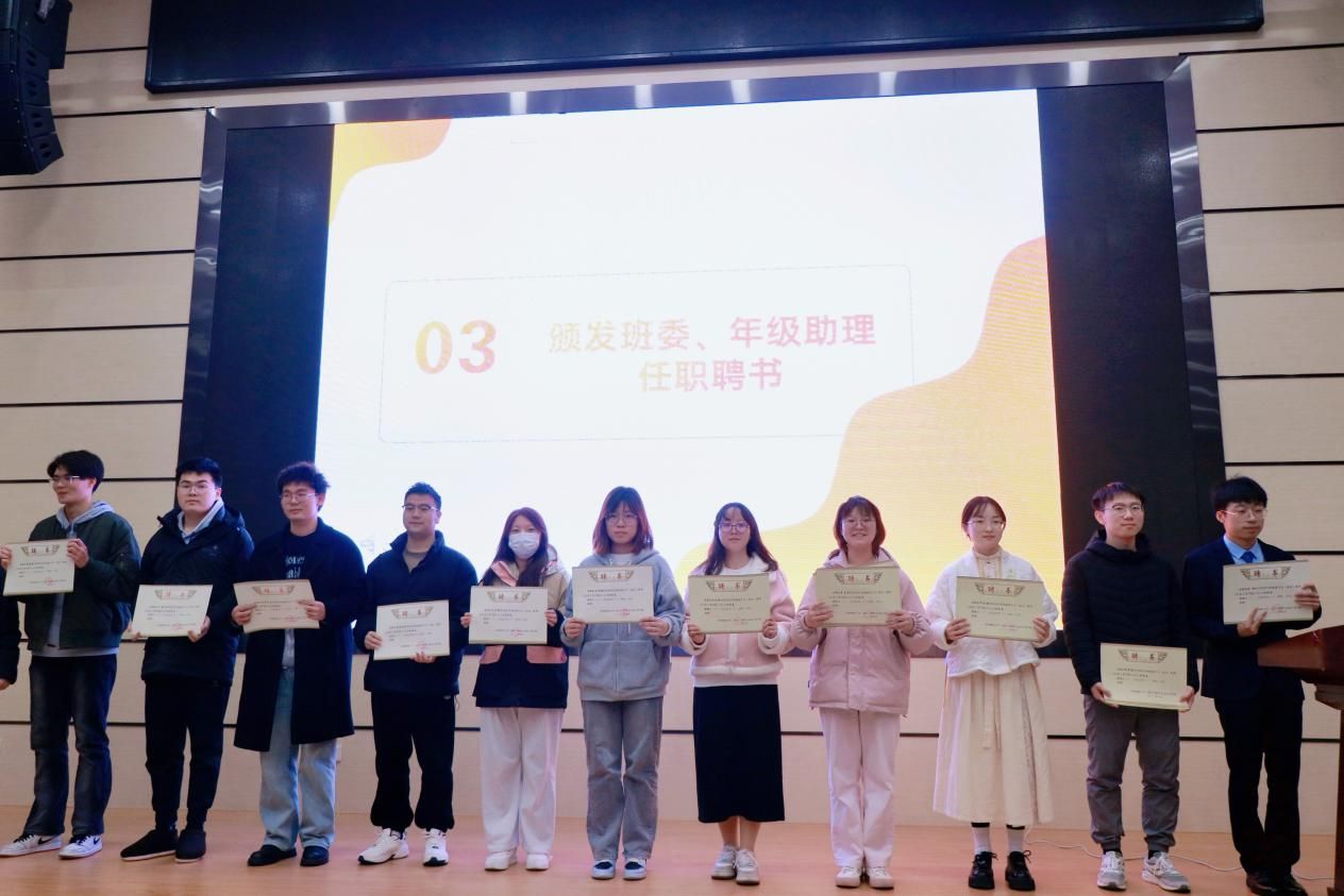 年级大会上,熊程为2022级年级助理、班委颁发聘书,作总结讲话。他以亲切的话语向同学们表达了问候和祝福,以包容开放的心态指出同学们过去一年的不足,并深情寄语同学们不忘初心、踏实奋斗,锤炼过硬本领、提升能力素养,通过自己的不懈努力实现远大抱负和人生理想。